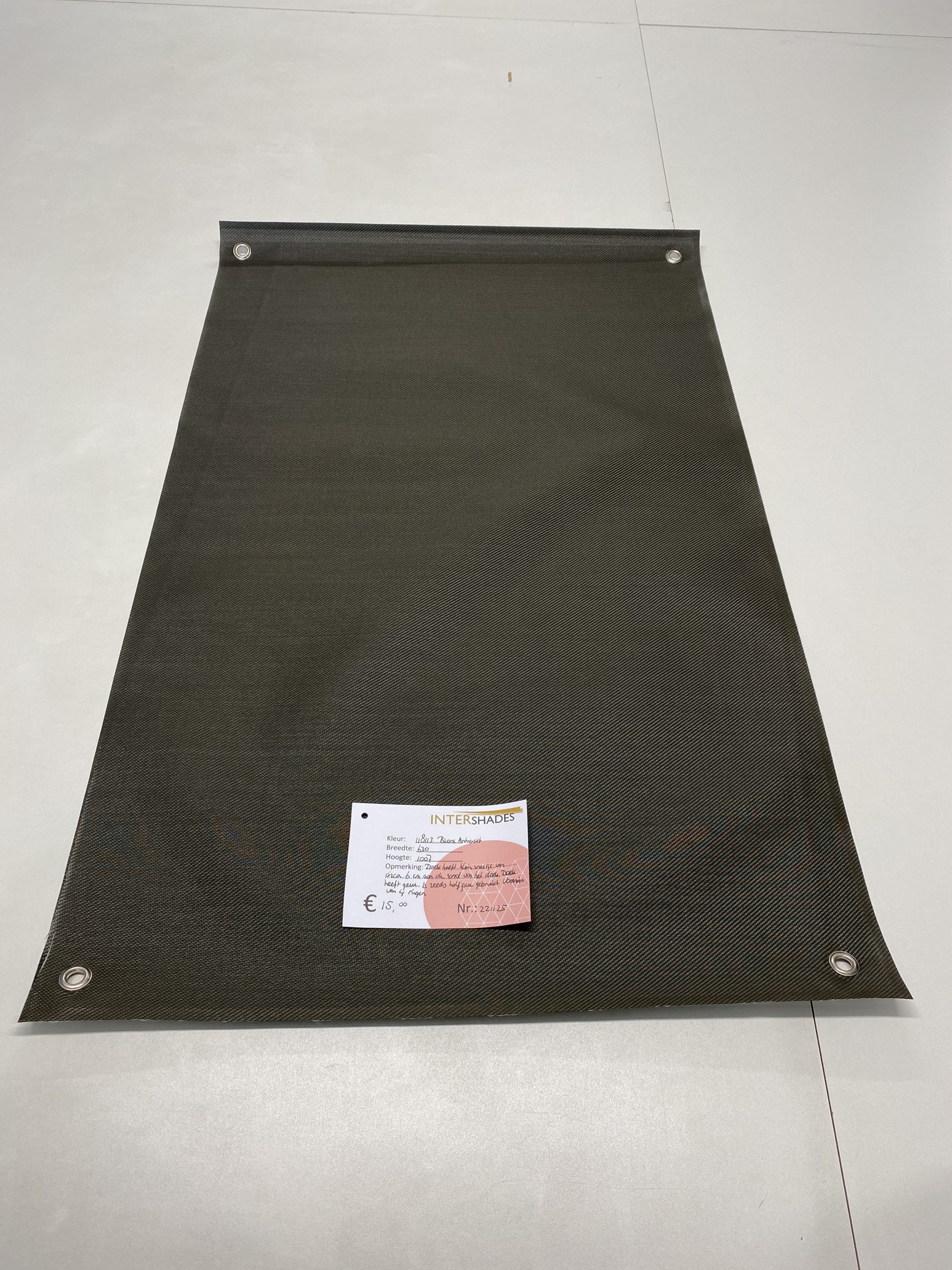 Opmerking: Doek heeft een klein sneetje aan de rand van het doek. Doek heeft geur. Is reeds half jaar gebruikt. Voorzien van 4 zeilringen.