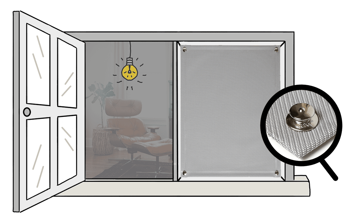Zie jij ook niks? Juist, dat is nou net de bedoeling met Xinix doek. Xinix komt letterlijk van: “Ik zie niks”. Dit verduisterende doek houdt de zon buiten, waardoor jij heerlijk kunt douchen zonder dat je buren kunnen gluren en heerlijk kunt slapen zonder pottenkijkers. Wil je graag de warmte weren, dan kan dit doek je optimaal helpen. Dit type doek is namelijk een erg goed zonwerend doek en ligt qua resultaat net wat onder rolluiken. De achterzijde van het Xinix doek is voorzien van een aluminium/grijs gekleurde opaque laag. Door deze laag kun je niets meer zien en hou jij de warmte in de zomer optimaal buiten (en in de winter juist binnen). Het doek is aan de voorzijde geweven en komt overeen met de weving van een 1% screendoek (1% openingsfactor). De doeken kun je gemakkelijk bevestigen op de muur met tenax sluitingen. Deze tenax knoopjes druk je als het ware vast op het knopje in de muur. Super eenvoudig dus!